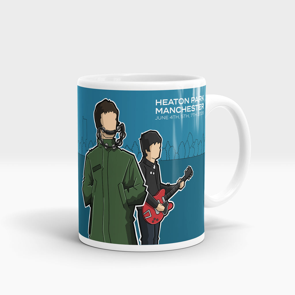 White ceramic mug with my illustration that celebrates Oasis gig in their home town of Manchester in 2009